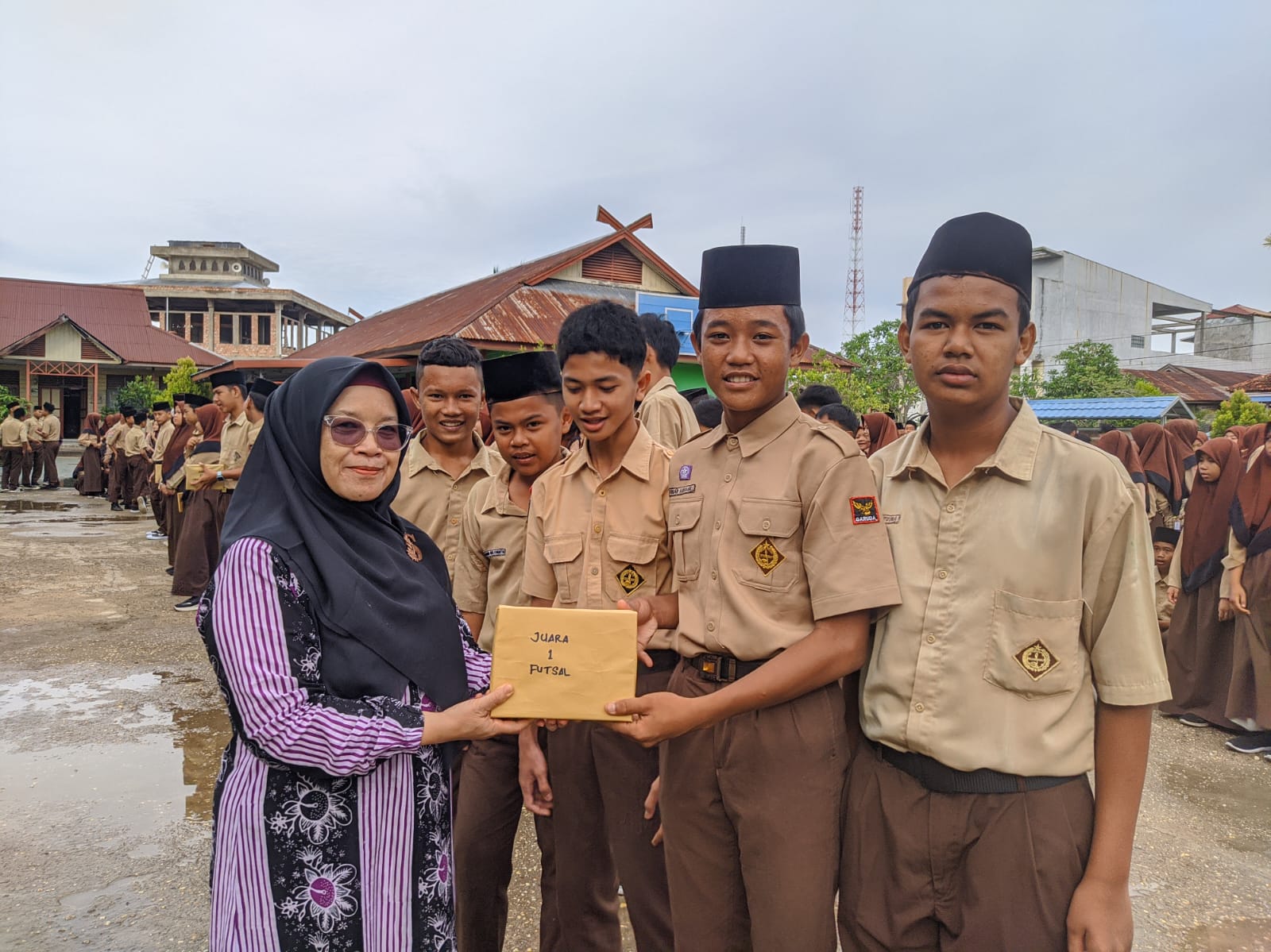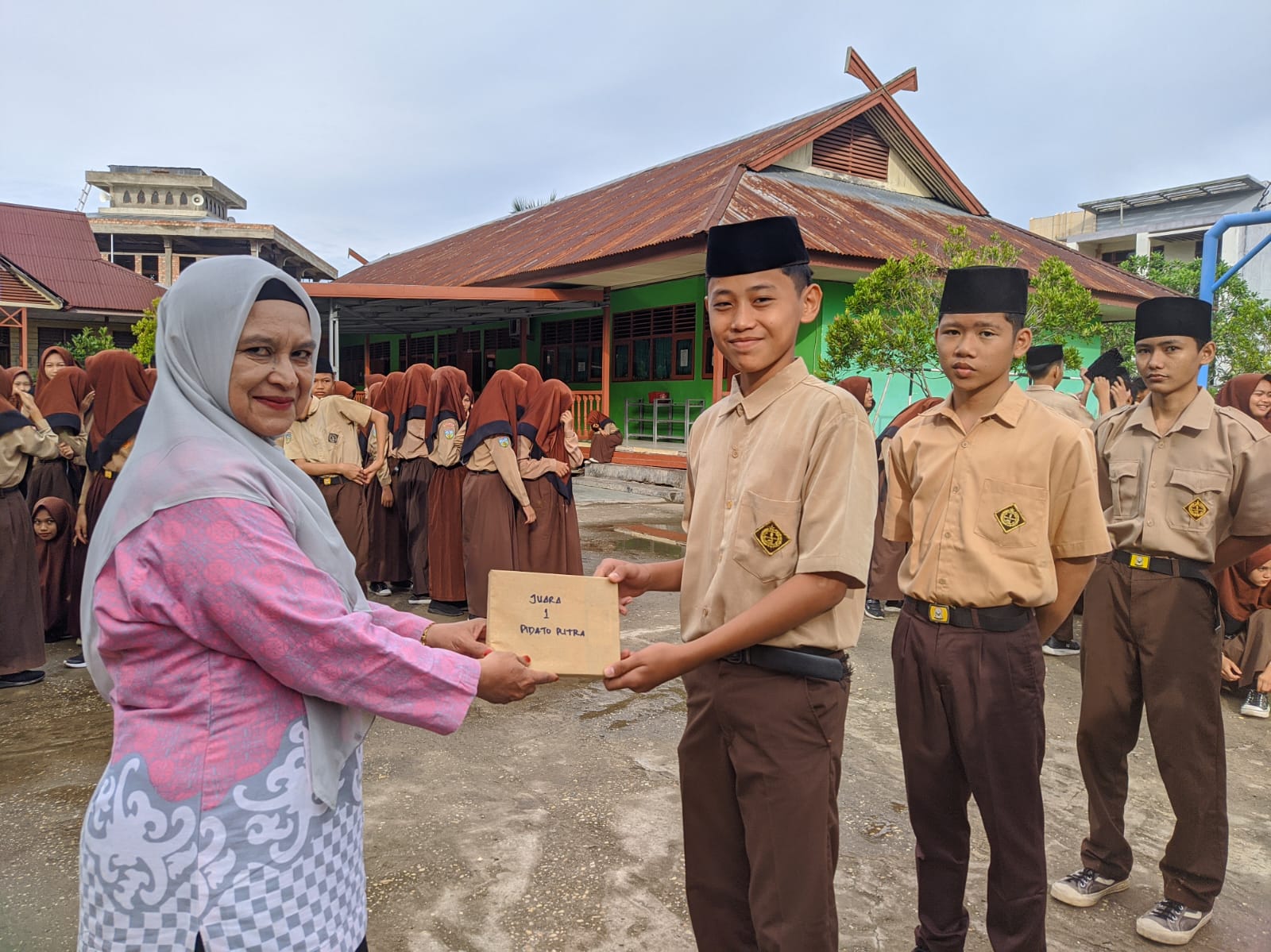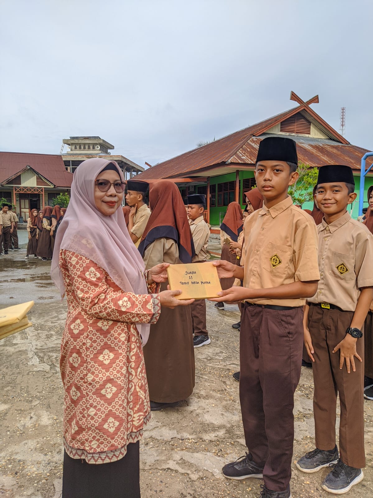 Selanjutnya acara dilanjutkan dengan pengumuman dan pemberian hadiah para pemenang lomba pada kegiatan class meeting semester 1 tahun pelajaran 2024/2024. Adapun pemenang lomba adalah sebagai berikut : Lomba Pidato Putra Juara 1 atas nama Mhd Zidan Al-Farisy kelas IX B, juara 2 Alif Hidayatul Muslim kelas VIID, juara 3 M Arya Ramsana kelas IX A. Untuk lomba pidato putri juara 1 diraih oleh Anisa Patimatuzzahra kelas IX D, juara 2 Keisya Shakira kelas IXB dan juara 3 Andini Yasmin kelas IXF. Selanjutnya lomba Tahfidz Putra unutk juara 1 diraih oleh M Akbar Muzaki kelas IX C, juara 2 Arbiansyah kelas VIII Bdan juara 3 terdiri dari 2 orang dikarenakan nilai yang sama yaitu Raihan Nazat Arfa kelas VIIC dan Ahmad Zainuddin Sulaiman kelas VIIA. Untuk Juara Tahfidz putri juara 1 diraih oleh Raudhatul Usna kelas IX E, juara 2 Fitriyatunnisa kelas VII B, dan juara 3 juga diraih oleh 2 siswi yang memiliki nilai sama yaitu Aulia Rahma kelas IX F dan Haliza Husna kelas VIIIB. Barikutnya lomba tenis meja putra, juara 1 diraih oleh Muhammad Syaikhu kelas IX A, juara 2 Izzat Zikri kelas VIIC, dan juara 3 M Dzaki Alfarizi kelas VIIIC. Unutk lomba tenis meja putri juara 1 diraih oleh Razwa Raura kelas IX D, jauar 2 Nur Asyifa Aulia kelas VIII A, dan juara 3 Hafiza Nzla kelas VIIE. Kemudian lomba senam jambi emas juara 1 diraih oleh kelas IX F, juara 2 diraih oleh kelas VIII E dan juara 3 kelas IX A. Untuk lomba futsal adapaun juara 1 berhasil diraih oleh kelas IX F, juara 2 kelas VIIIF dan juara 3 diraihnoleh kelas VIIE.