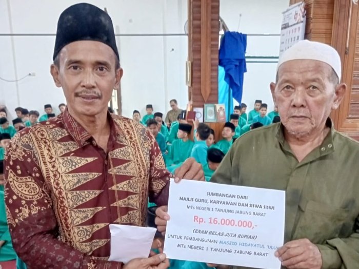 Total sumbangan yang berhasil dihimpun mencapai angka Rp16.000.000 (enam belas juta rupiah). Dana tersebut merupakan akumulasi dari infak sukarela yang dikumpulkan secara bertahap, mencerminkan kuatnya ikatan kekeluargaan dan kepedulian sosial di lingkungan MTsN 1 Tanjab Barat. Kontribusi ini bukan sekadar bantuan materi, melainkan wujud nyata dari nilai-nilai karakter yang selama ini ditanamkan di madrasah, yakni gotong royong dan cinta terhadap tempat ibadah.